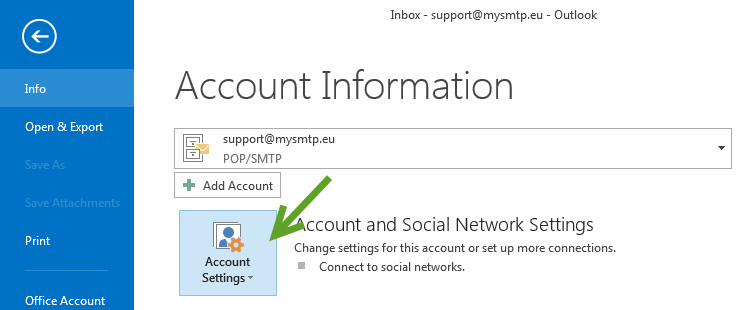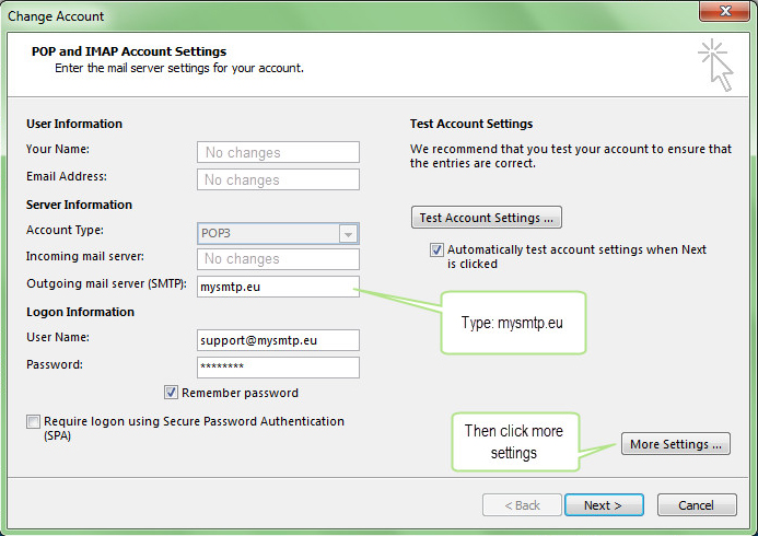 and then "Test Account Settings" to test whether you can send e-mails with the new setup.