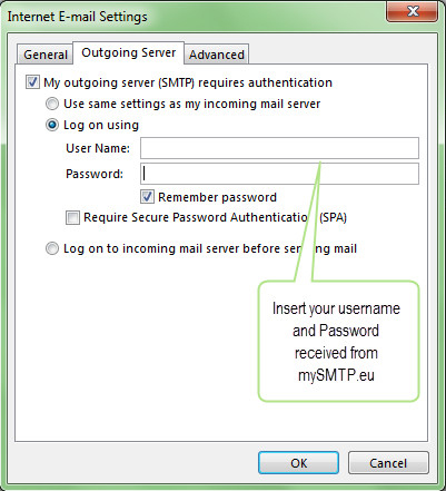 Step 4 Click on "Internet mail", then "Outgoing Server" and tick "My outgoing server (SMTP) requires authentication". Select "Log on using".